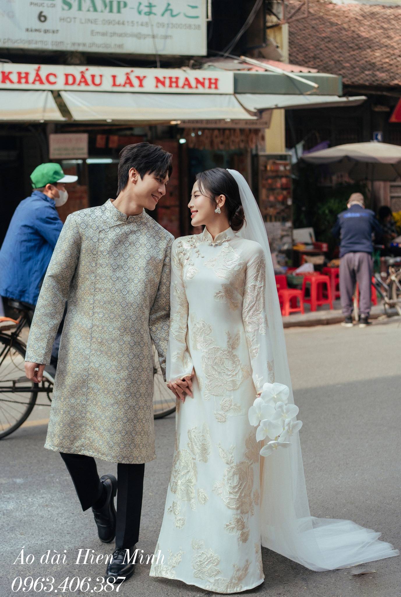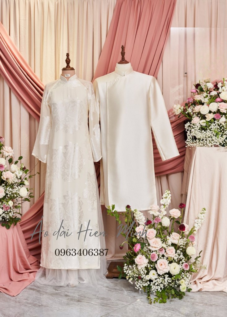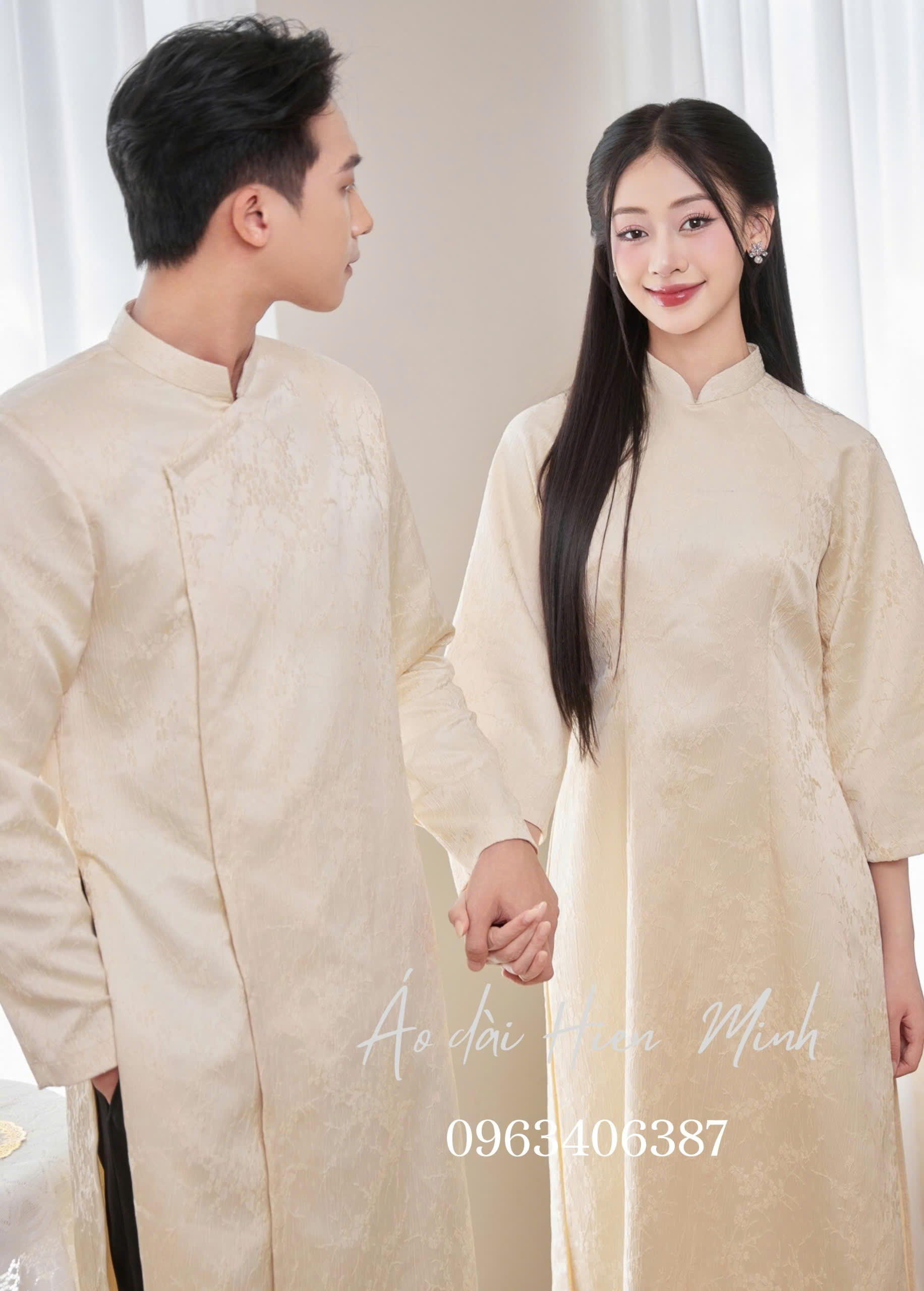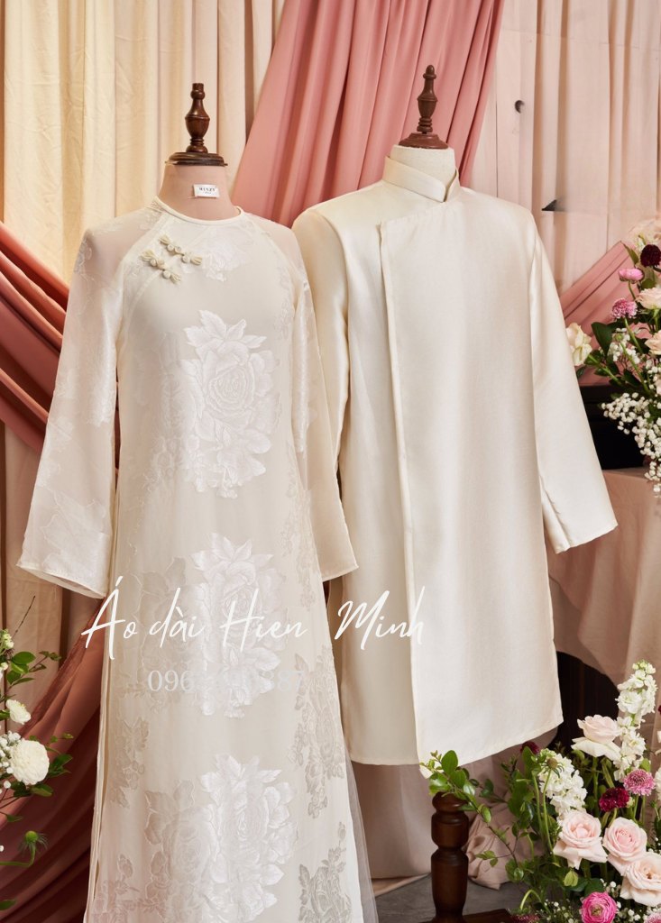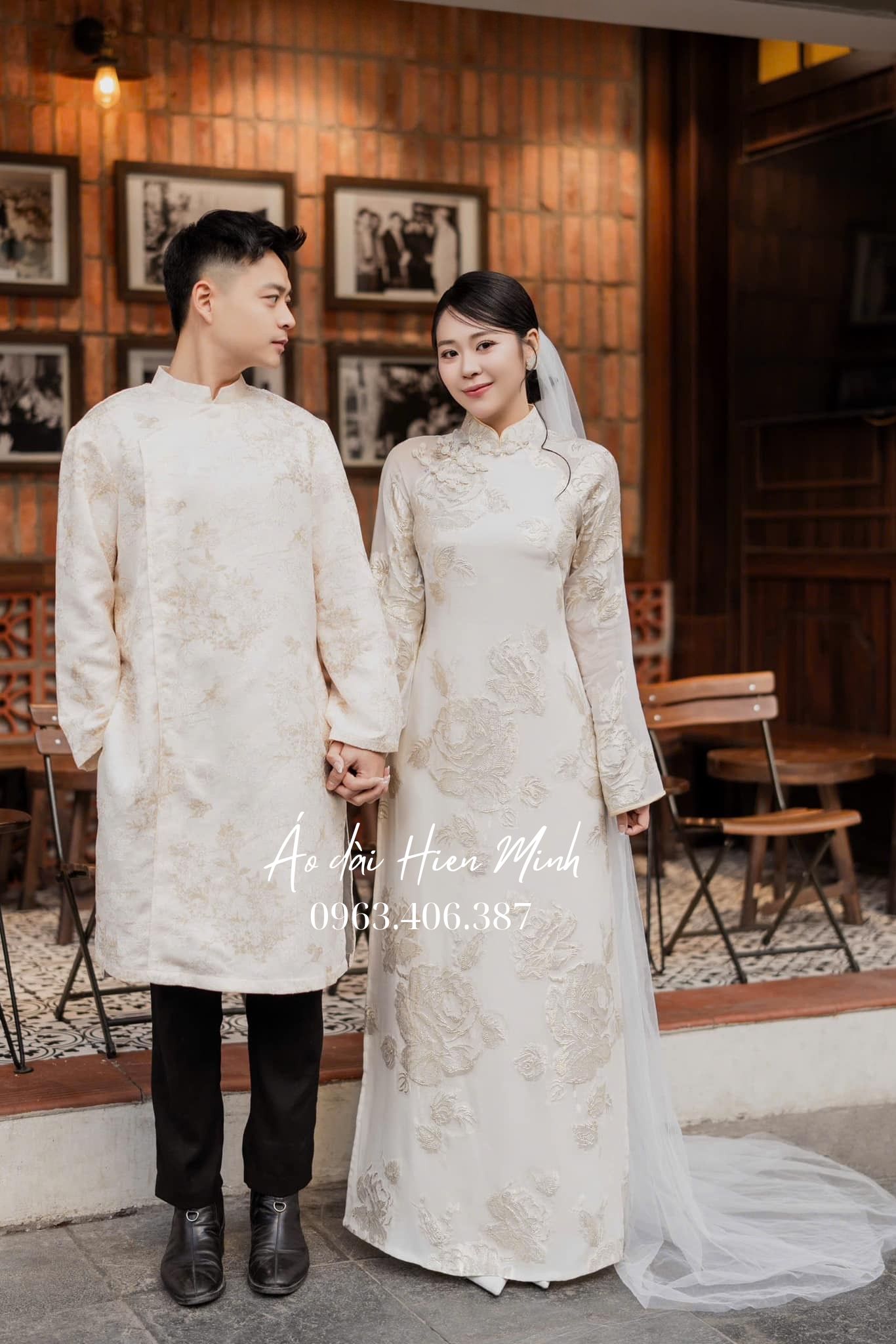 Mẫu áo này tạo sự đồng điệu hoàn hảo khi chú rể chọn áo dài Kem Gấm đồng màu , tạo nên sự sang trọng, thanh lịch cho cặp đôi trong ngày cưới