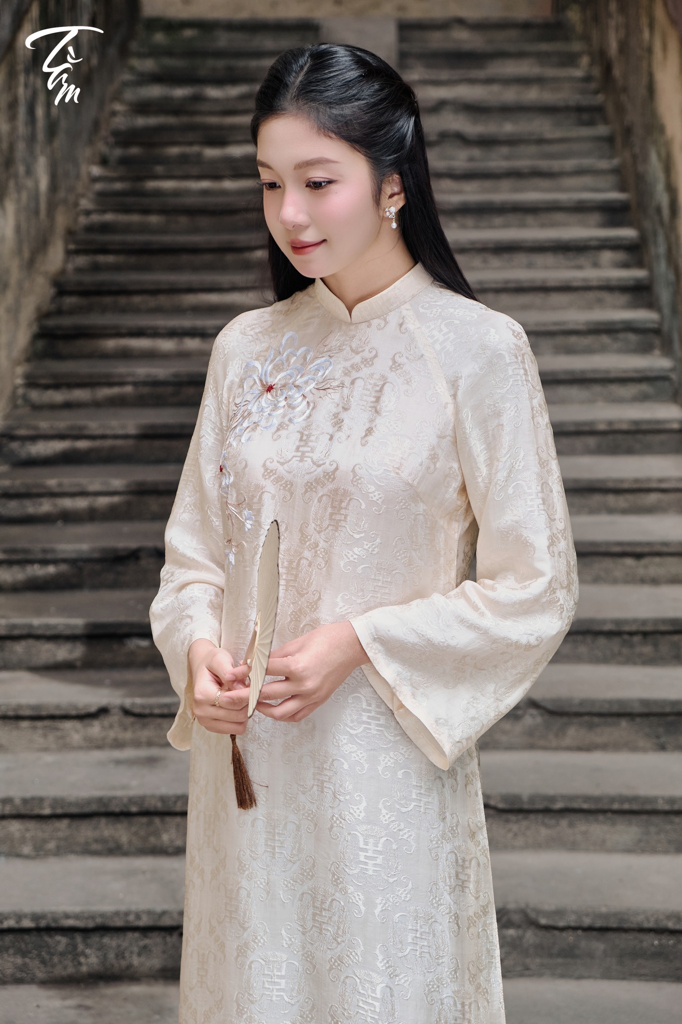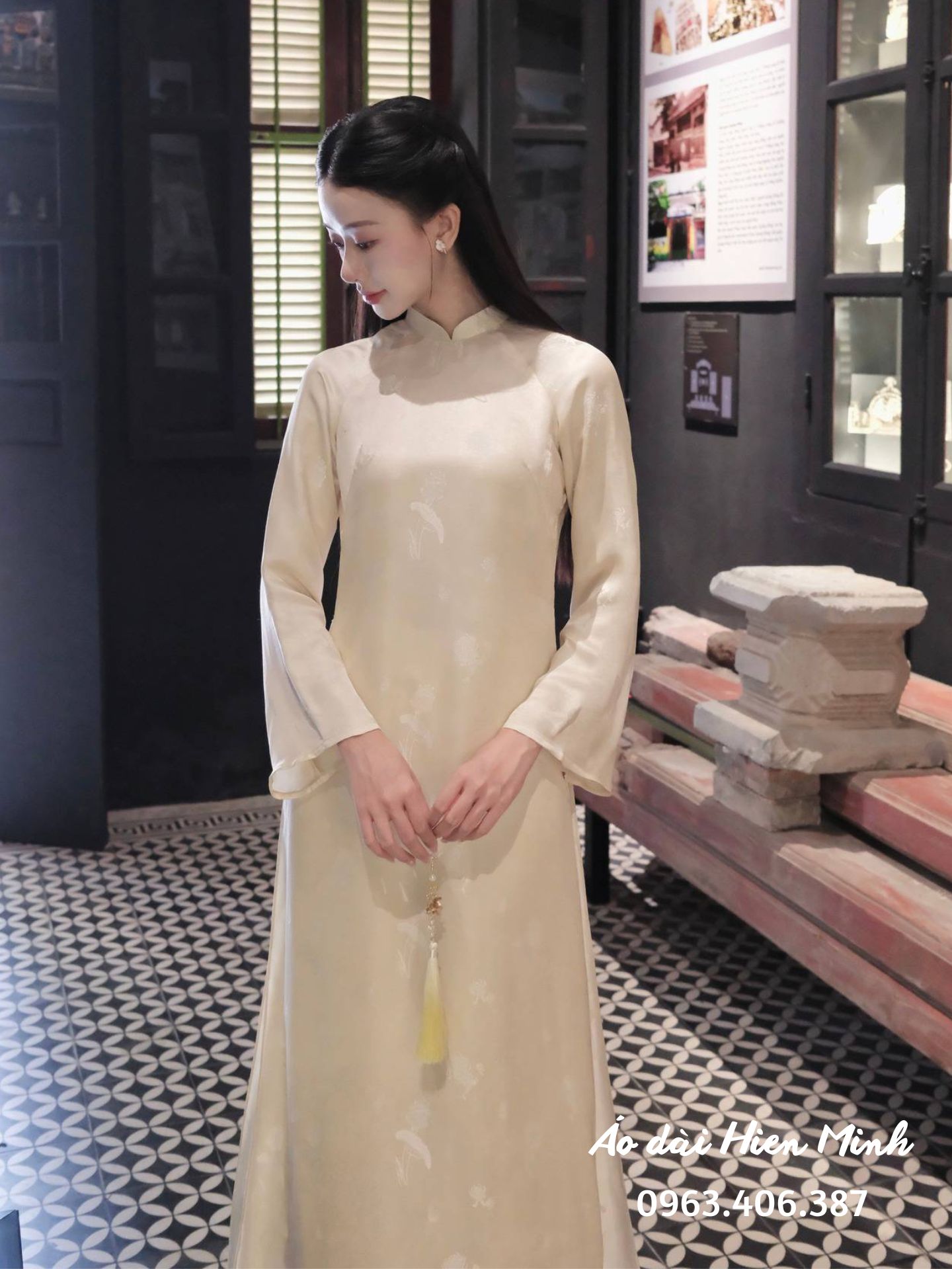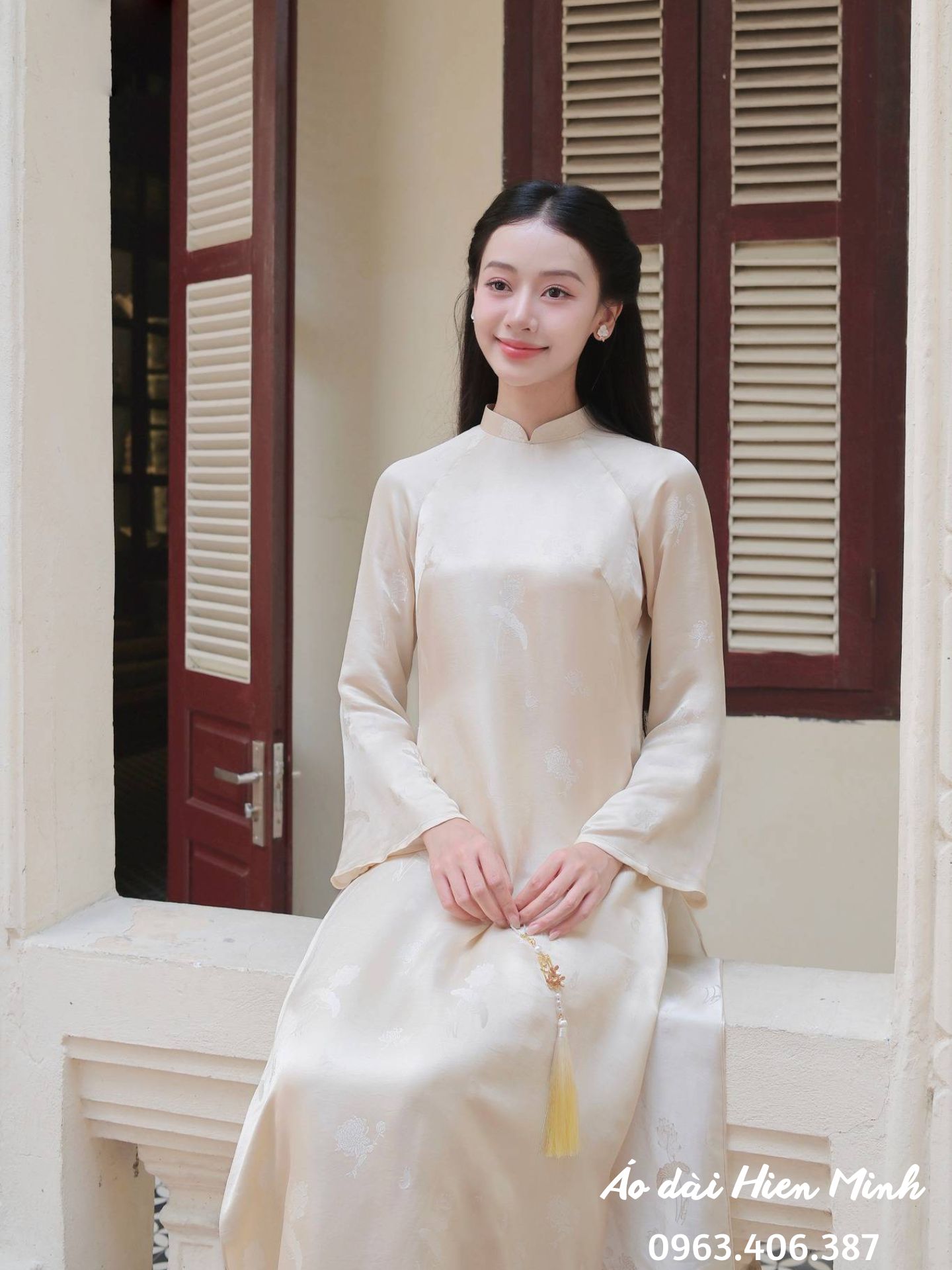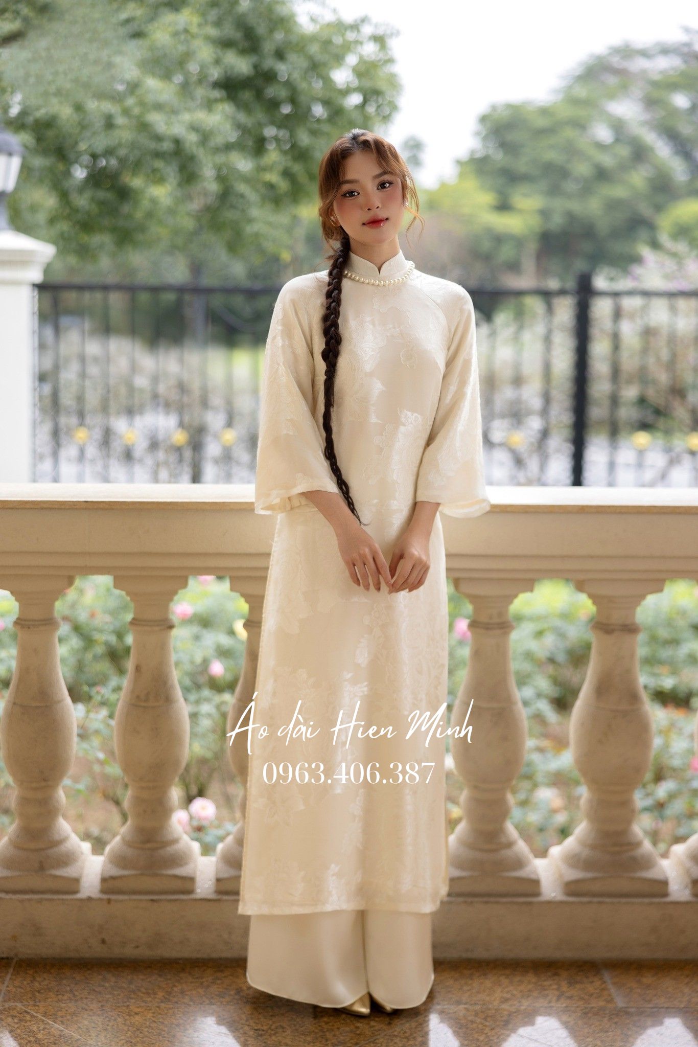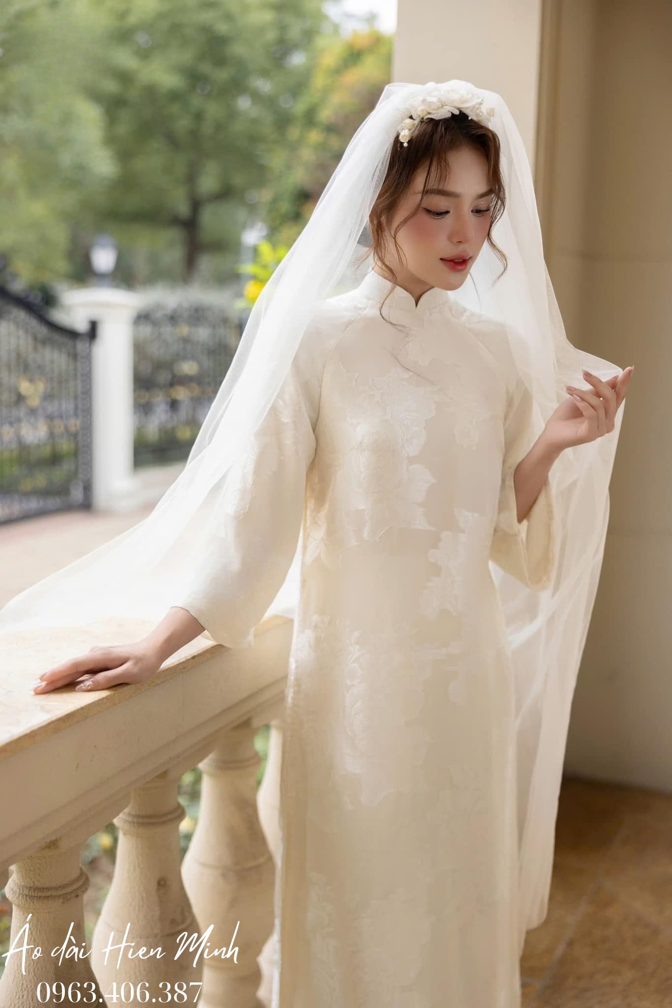 Áo dài cưới màu kem gấm dệt hoa chìm – sang trọng, hiện đại