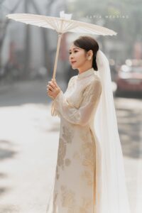 Không chỉ mang lại vẻ đẹp nhẹ nhàng, sang trọng, sắc kem còn phù hợp với hầu hết concept đám cưới – từ không gian gia tiên truyền thống đến studio hiện đại. Dù đặt ở bối cảnh nào, chiếc áo dài màu kem vẫn nổi bật theo cách rất tinh tế: mềm mại, thanh khiết và tôn lên khí chất nền nã của cô dâu.