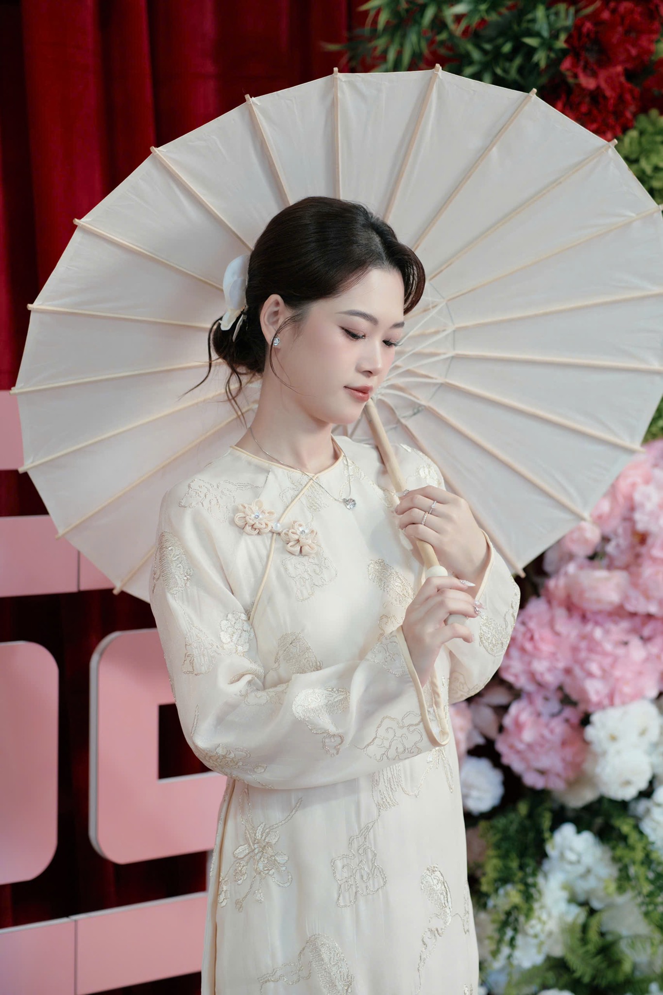 Chiếc áo dài sử dụng nền vải màu kem dệt hoa văn chìm sang trọng, kết hợp với phần vai áo, tay áo và tà áo dạng lưới mỏng (voan xuyên thấu). Chi tiết này giúp tôn lên đường vai thanh mảnh cũng như che mọi khuyết điểm. Nàng chỉ cần khéo léo thêm chiếc voan cài tóc nhẹ nhàng là đã mang lại cảm giác lãng mạn, bay bổng mà vẫn đủ kín đáo và trang trọng.