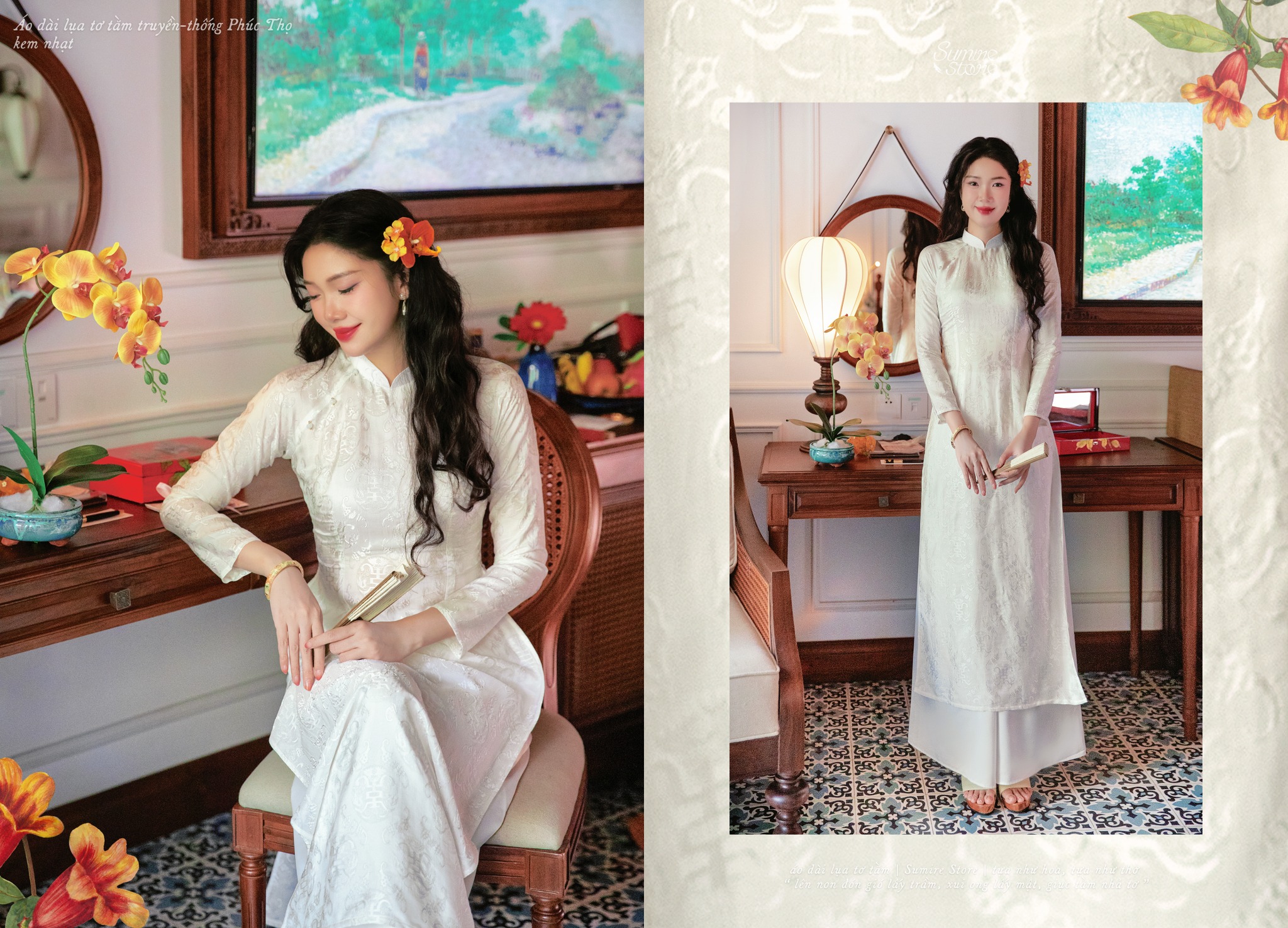 Mẫu áo dài này tập trung vào vẻ đẹp tối giản nhưng vẫn đầy ấn tượng. Thiết kế trơn, họa tiết chìm tinh tế trên nền vải gấmgiúp tôn lên form dáng thanh thoát Cổ áo truyền thống, tay áo lửng , kết hợp cùng đường xẻ tà duyên dáng, tạo nên sự hài hòa và tôn vinh vóc dáng người mặc. Sự đơn giản này chính là chìa khóa tạo nên vẻ đẹp sang trọng, không phô trương nhưng vẫn thu hút mọi ánh nhìn.