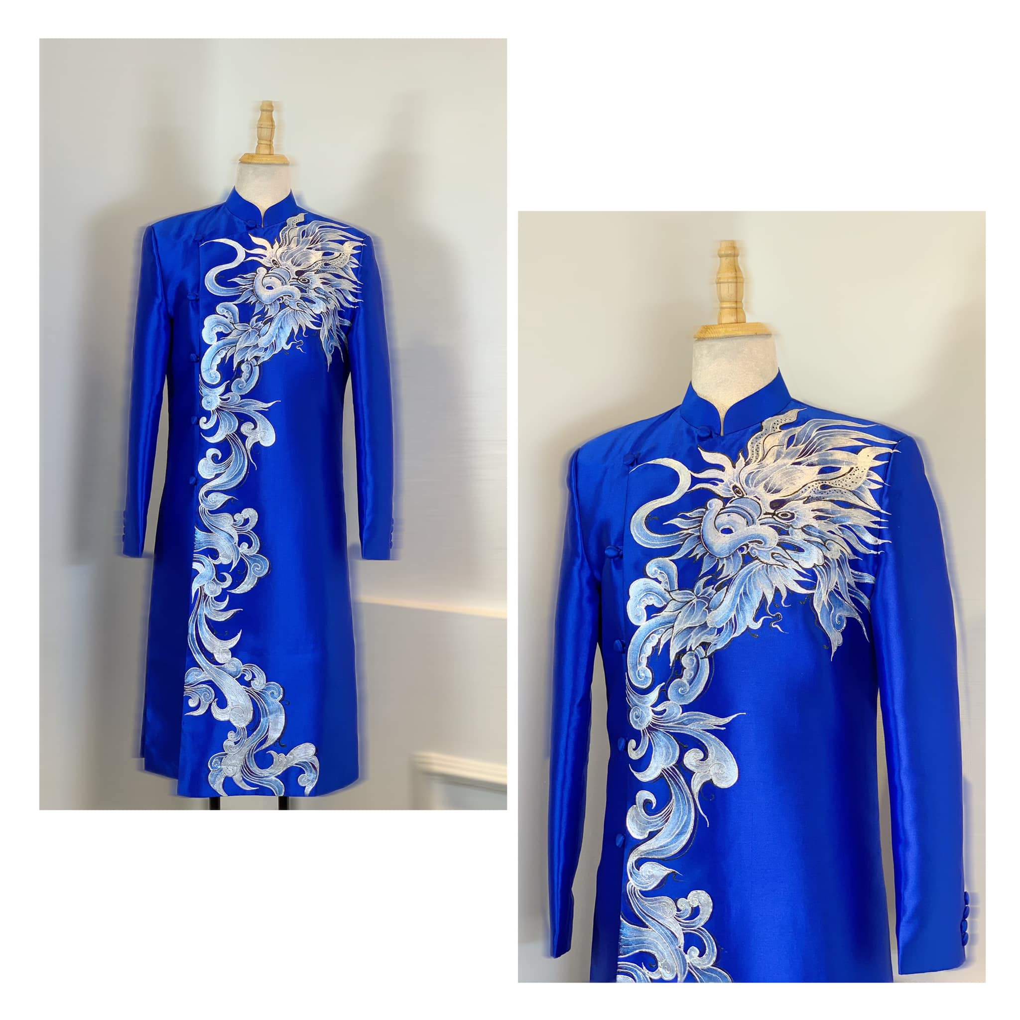 Họa tiết rồng bạc được vẽ cách điệu rất tỉ mỉ tạo ra sự sang trọng, đẳng cấp đầy cá tính cho người mặc