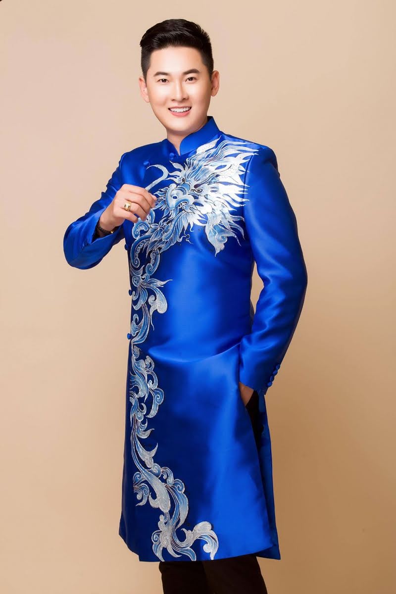 Áo dài cách tân nam màu xanh dương họa tiết rồng vàng