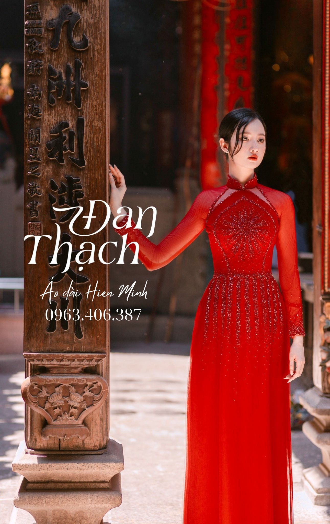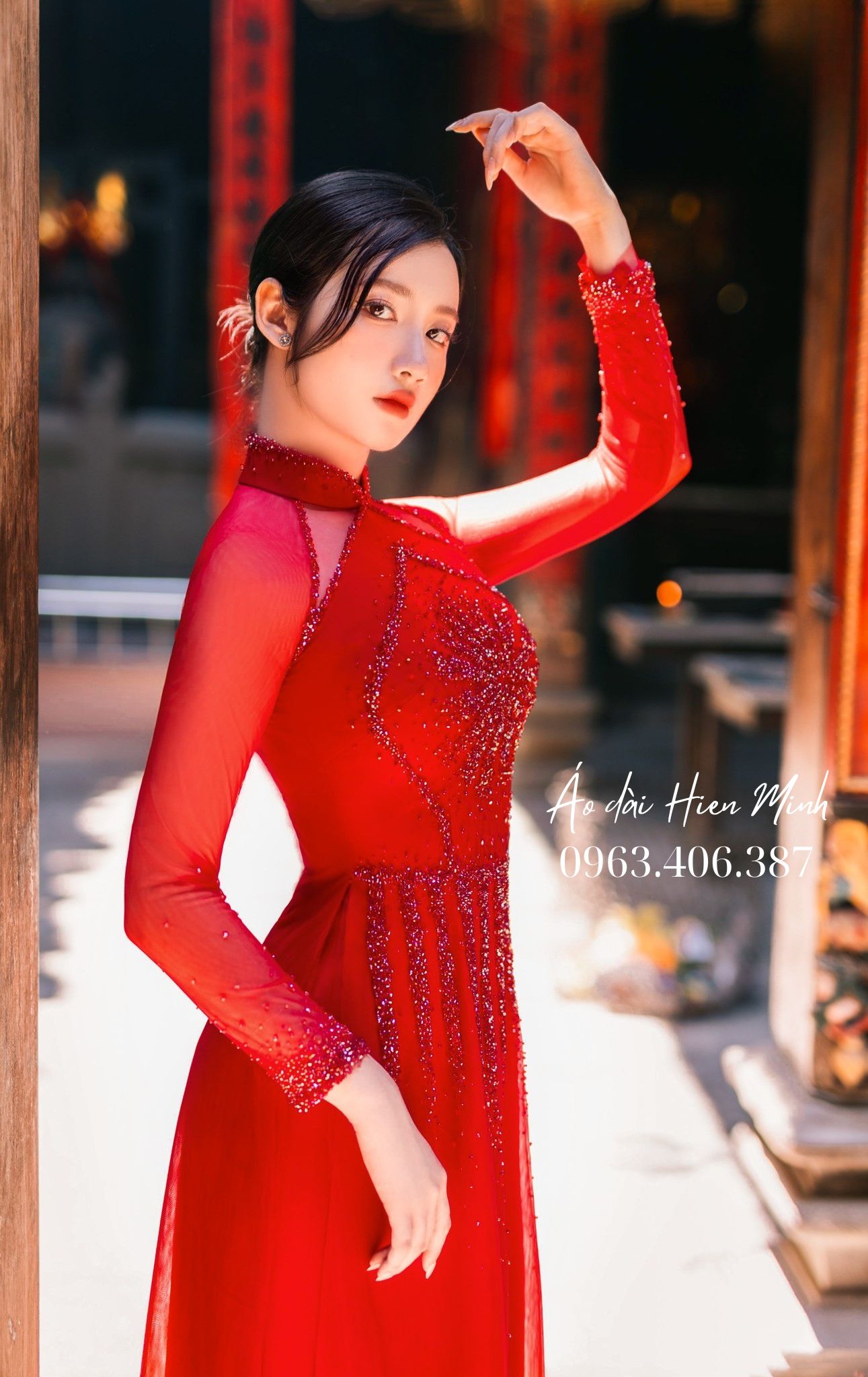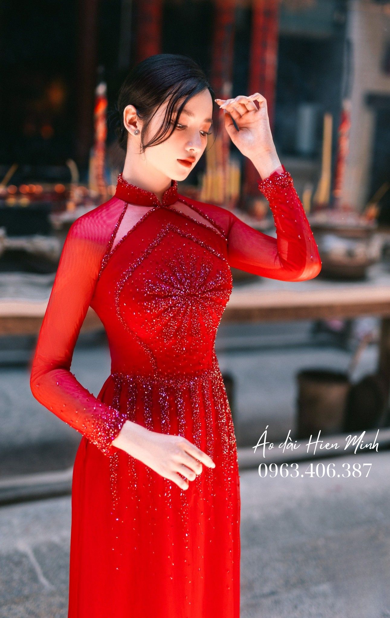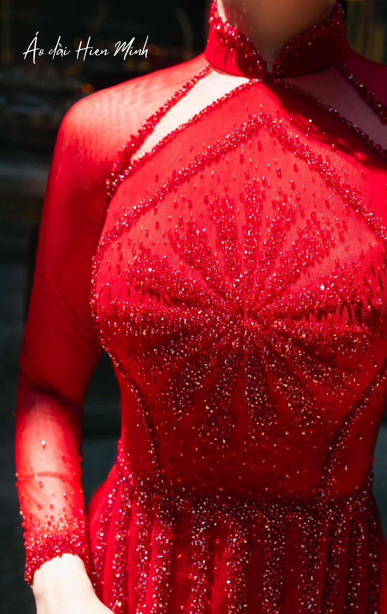 Áo dài mang sắc đỏ tươi tực rỡ, là gam màu chủ đạo trong lễ cưới hỏi của người Việt, tượng trưng cho sự may mắn, tài lộc, tình yêu nồng nàn và hạnh phúc viên mãn. Sắc đỏ này có khả năng tôn da tuyệt vời, giúp cô dâu trông rạng rỡ, tràn đầy sức sống và nổi bật hơn bao giờ hết.