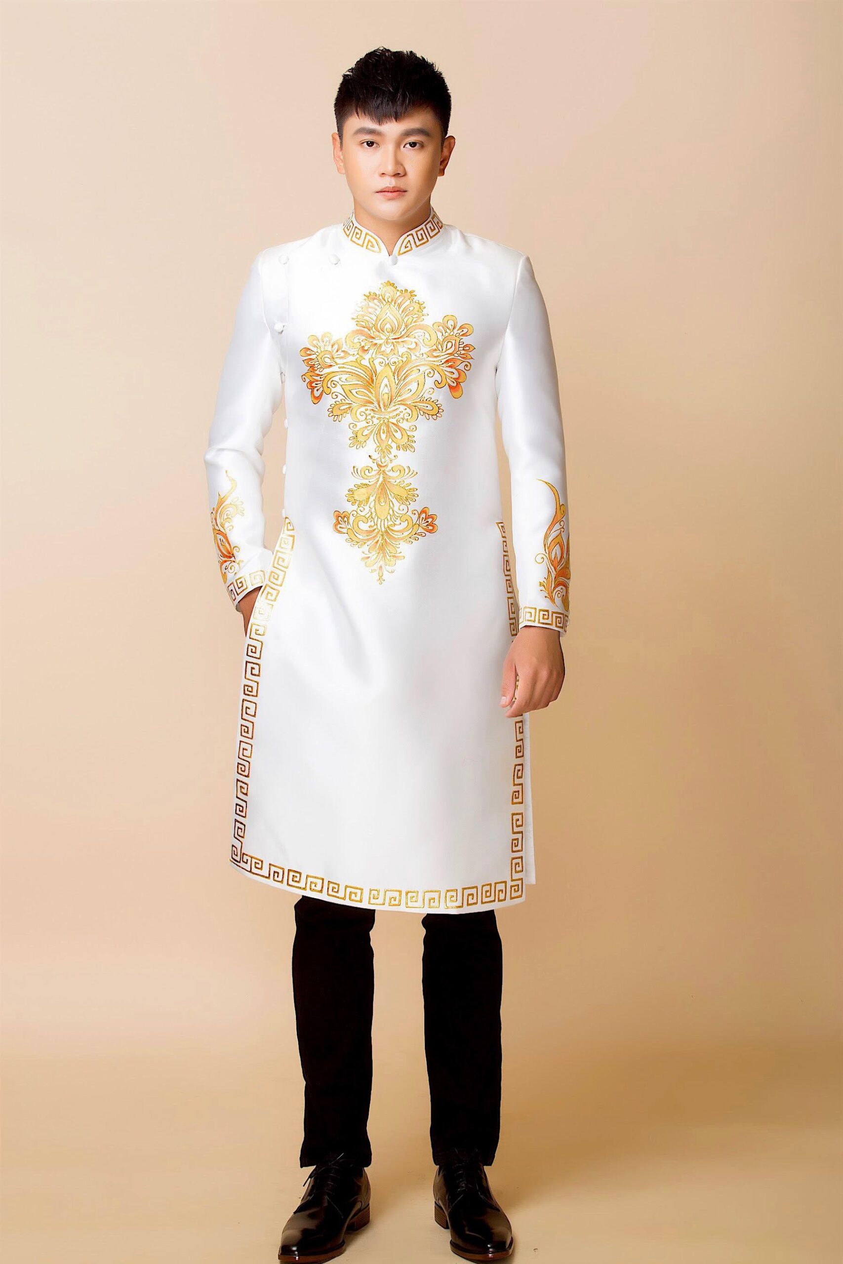 1. Kiểu dáng thiết kế, tính năng của áo dài cưới hỏi đơn giản cho chú rể màu trắng họa tiết vẽ tay