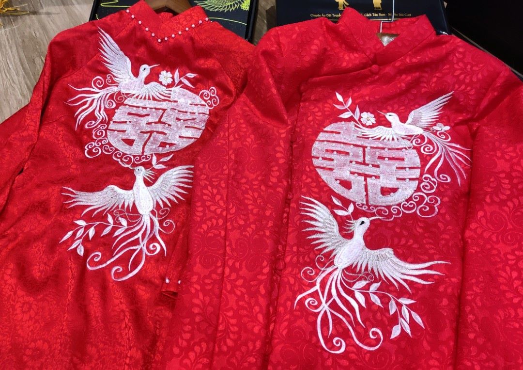 Áo dài đôi họa tiết song hỷ kết hợp cặp uyên ương mang ý nghĩa hạnh phúc, tròn đầy