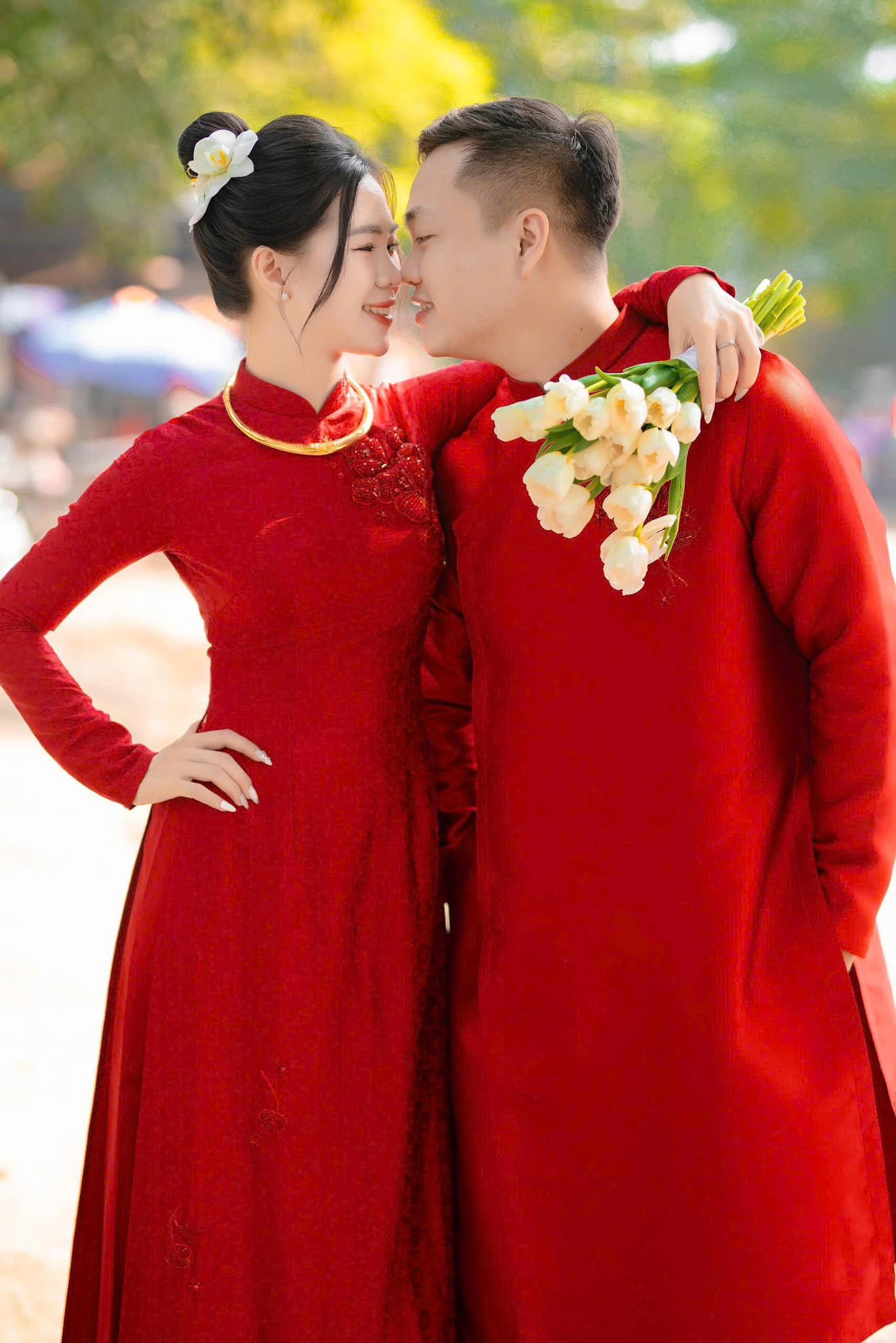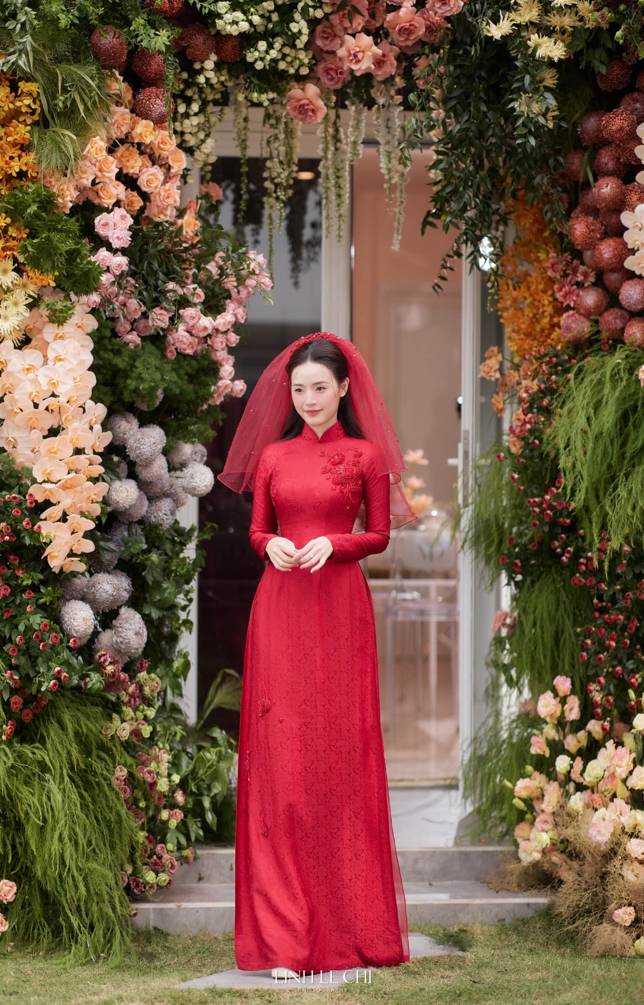 - May đo riêng: Áo dài được may đo chuẩn số đo từng cô dâu, đảm bảo vừa vặn, che khuyết điểm và tôn dáng tối đa.
